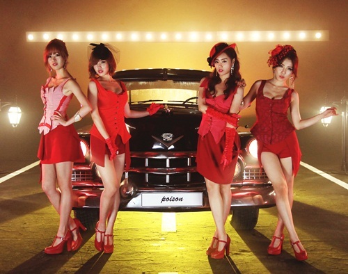 On to the music video. SEXY!!! Summed it up in one word. Basically, but the plot line is really flawless. I love the fact how they incorporated the “poison” bit into the song. Onto the plot: The music video was really dark. Hyosung was given the job to spike the detective, to distract him, I am assuming from the very start. The girls have previously made contact with the detective, or another male figure, who had the safe box’ code tattooed on his back. Hmmm. About that, not really that good. Well, Zinger writes that number down and hands it to the singer. They then band together to get to the safe. However one of the girls is taken hostage. But Hyosung, comes in time with another gun, shooting both men down. The girls quickly steal the jewellery that was in the safe, and escape in a car. The detective soon comes and is confused. Yeah, basically that is the music video’s plot in a short summary.