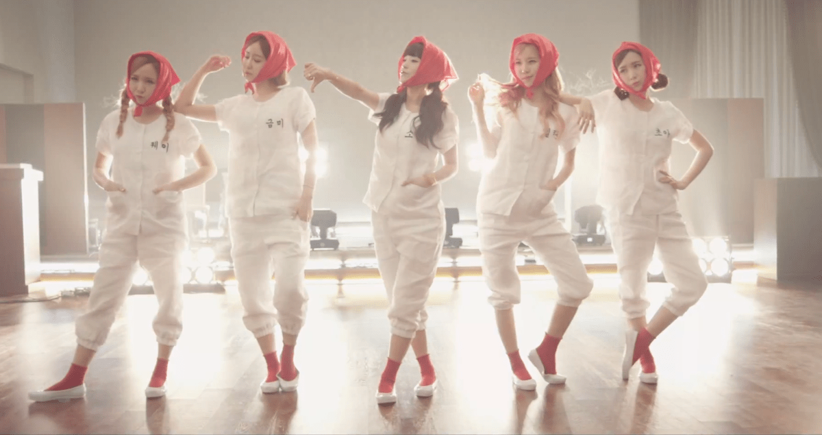 The music video is pretty cool. We get a ball like theme, as the girls trade their helmets for really stunning black dresses, which I find really suits them. They look so adorable. Then the song starts and they breaking up the party with their really cool “Ahjumma” style clothing, with those scarves on their heads. Basically something you would find in the Korean country side. I just love all the aspects in this music video. We can see a clear distinct or well-funded. No more white screens backdrops for these girls, they are out in the real world guys. Something I think many entertainment companies must think about. One minor complaint, and that is towards the bald guy. Yeah, he seemed a little annoying in the whole music video mainly because he seemed to be the odd one out and jumping around as if he was the 6th long-lost member of the group. Wait a minute…