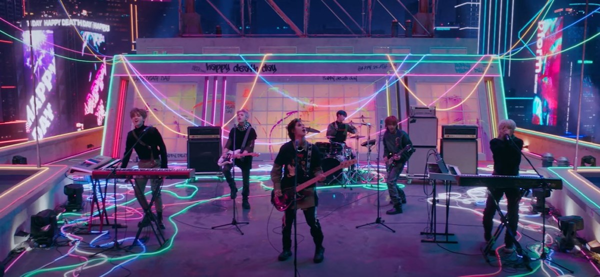 How twisted is this music video? The premise of this music video is a child’s birthday party, where the members are invited to be the entertainment for the party – a clown band. But that image doesn’t fit the song. So the members rip off their clown accessories and proceed to rock out. But what lead them to this? They were sent to bring back the attention of the guests, by pointing out that while the kid was celebrating its birthday, the party guests were all disinterested in the whole event, even being on their phones during the most important part of the party – the blowing out of the candles (most important because you get cake right after). But the message the video was trying to get at is that the party could have been a birthday celebration or a ‘Happy Death Day’ celebration, marking the kid’s one step closer to its death, and the guests would not even notice. I did say it was a twisted video, but well thought out if I was being honest. Elsewhere, the members perform on the roof of a virtual world and the underground basement of a building. The ending seems to suggest a continuation, so I guess we will be seeing more of the virtual world in the future.