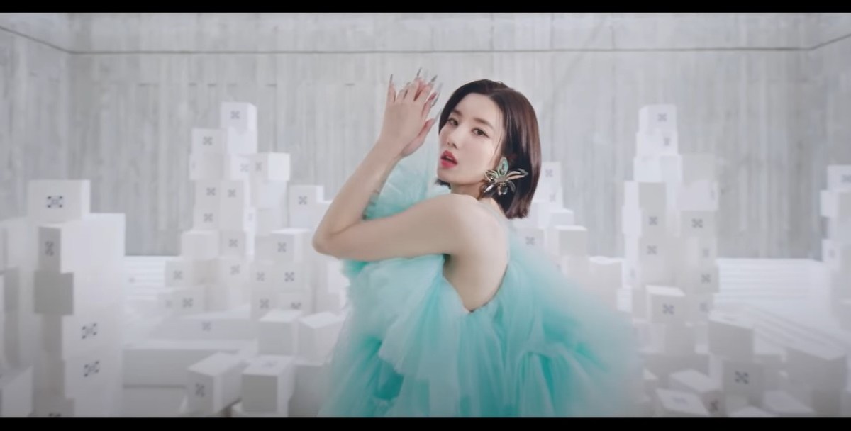 As for the music video, the glitchy effect comes through in a visual sense thanks to the post-production. It makes sense that they also went in this direction for this music video. But I like how it the video wasn’t just an overwhelming amount of just post-production that made the video look cool. There was actually really promising shots and cinematography throughout this video. Some of the choreography shots relied on a glitchy background displayed on the big screen, and I liked the subtle yet prominent blue colour theme in this video. Kwon Eun Bi also looks awesome and very pretty throughout the video, with her outfits showcasing an awesome sense of style.