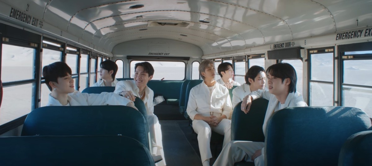 When I watched the video for Yet To Come, I felt the shots were throwbacks to previous videos. The order in which the members sat and ended the music video in was the order in which the members sat in for their Just One Day music video. V holding a red rose throws back to solo teaser photos from their Map of The Soul: Persona and Boy With Luv (ft. Halsey) comeback. His uniform also seems to remind me of their ‘school uniform days’ which encompasses their School trilogy days, most specifically Boy In Luv. Jungkook standing in front of the rusty blue ‘You Never Walk Alone’ wheel, the train (which featured in J-Hope’s solo shot) and Jimin’s white shoes takes me back to Spring Day. The pick-up truck we driving around and in the background of JIN’s shot brings back memories of RUN‘s ending. RM’s solo shot consist of a shipping container, which seems to link up with their RUN music video, as well. The big winged statue and the scene where JIN covers V’s eyes reminds me of Blood Sweat & Tears. Suga’s solo scene with the butterfly might be connection to their Butterfly song from 2015. The yellow school bus we see at the end reminds us of the bus that featured in No More Dream music video. Aside from the trip down memory lane, the video was shot in beautiful desert location that feels quite scenic despite it being just sand and blue skies.