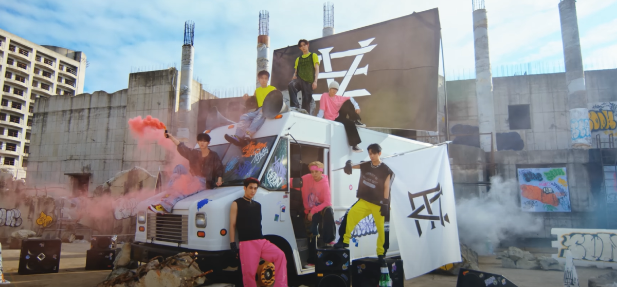 The music video shows the members causing trouble, fitting for the title and messaging they have behind the lyrics. First up is a series of explosion at an old building, which leads to the group becoming wanted. Secondly, they are seen driving away (which I presume they are doing to evade the authorities). Then, whilst covering the other members driving away on the news, Keita (the newsreader) stops working and steps away from his job. From there, the group hangs out and have fun with each other. The scenes in which we see the group play cards and hang out in the dark shows a more charismatic and playful side of the group, representing the side of the song that speaks to the members’ charm and innocence. I did think the group could have been more wild in the music video, but what we got is fine. However, I did think the start of the video could have started off with a breaking news type of announcement, rather than just silence.