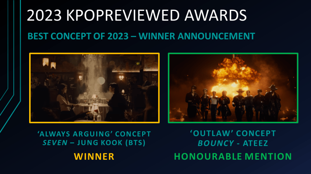 Best Music Video of 2023 Nominees: ERASE ME – ONEUS, Roar – THE BOYZ, S-Class – Stray Kids, Sugar Rush Ride – TXT, Super – SEVENTEEN, Super Shy – NewJeansBest Concept of 2023 Nominees: ‘Always Arguing’ Concept in Seven – Jung Kook (BTS). ‘Angel of Death’ Concept in SOS – Kang Daniel, ‘Missing Frankenstein’ Concept in STRANGER – Sunmi, ‘Outlaw’ Concept in BOUNCY (K-HOT CHILLI PEPPER) – ATEEZ, ‘Psychopath’ Concept in PSYCHO – JUN (SEVENTEEN) , ‘Toxic Love’ Concept in Guilty – TAEMIN (SHINee)