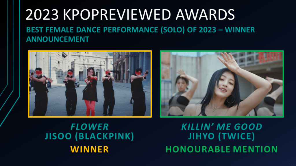 Best Male Dance Performance (Group) of 2023 Nominees: BOUNCY (K-HOT CHILLI PEPPER) – ATEEZ, MOVE – T5, ROAR – THE BOYZ, S-Class – Stray Kids, Super – SEVENTEEN, Sugar Rush Ride – TXT.Best Female Dance Performance (Group) of 2023: CAKE – ITZY, Eve, Psyche & The Bluebeard’s Wife – LE SSERAFIM, I AM – IVE, Like Me Like That – NMIXX, Queencard – (G)I-DLE, Super Shy – NewJeansBest Female Dance Performance Solo of 2023 Nominees: Flower – JISOO (BLACKPINK), Fast Forward – Jeon Somi, Killin’ Me Good – JIHYO (TWICE), Knock – LEE CHAE YEON, STRANGER – SUNMI, The Flash – Kwon Eun BiBest Male Dance Performance (Solo) of 2023 Nominees: Gulity – TAEMIN (SHINee), Nirvana – KANG DANIEL, PSYCHO – JUN (SEVENTEEN), ROVER – KAI (EXO), Set Me Free Pt. 2 – JIMIN (BTS), VIBE – TAEYANG (BIGBANG) ft. JIMIN (BTS)