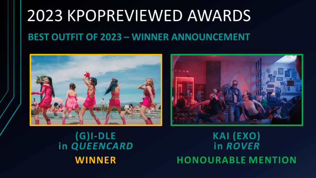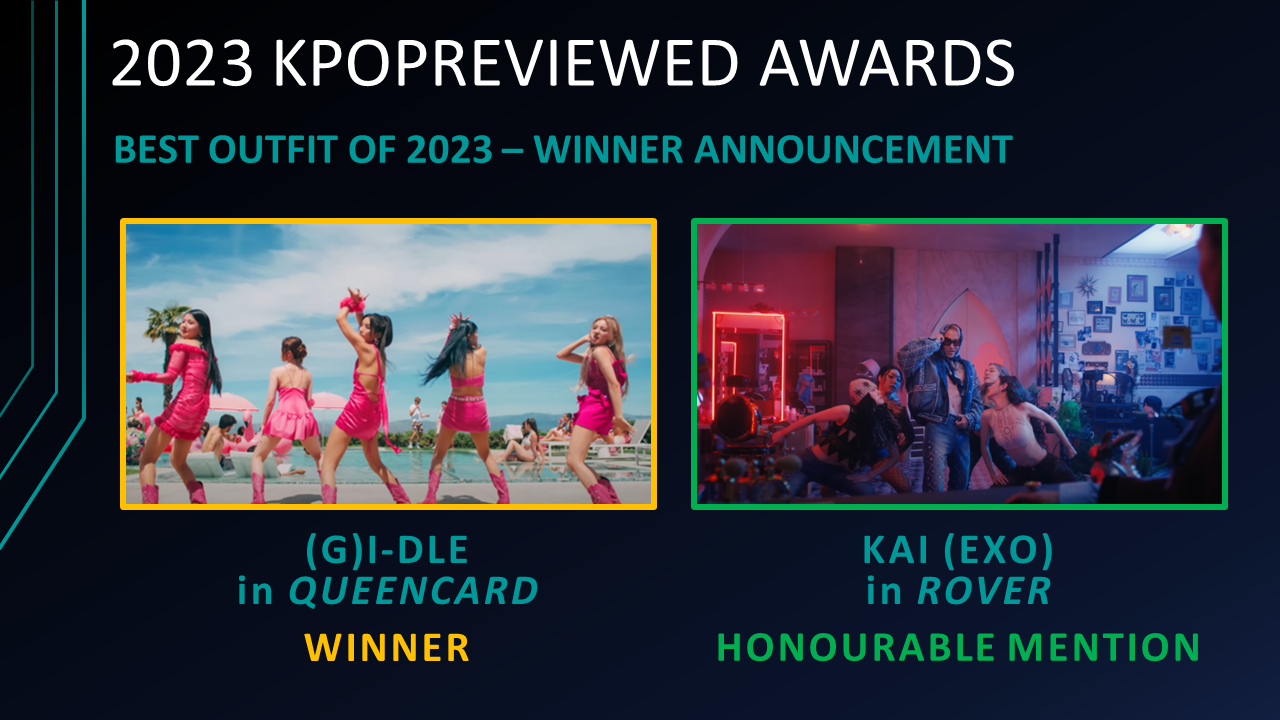 Best Outfits of 2023 Nominees: (G)I-DLE (in Queencard), KAI (EXO) (in ROVER), Jeon Somi (in Fast Forward), MISAMO (TWICE) (in Do Not Touch), NCT DOJAEJUNG (for Perfume), T5 (TREASURE) (in Move)