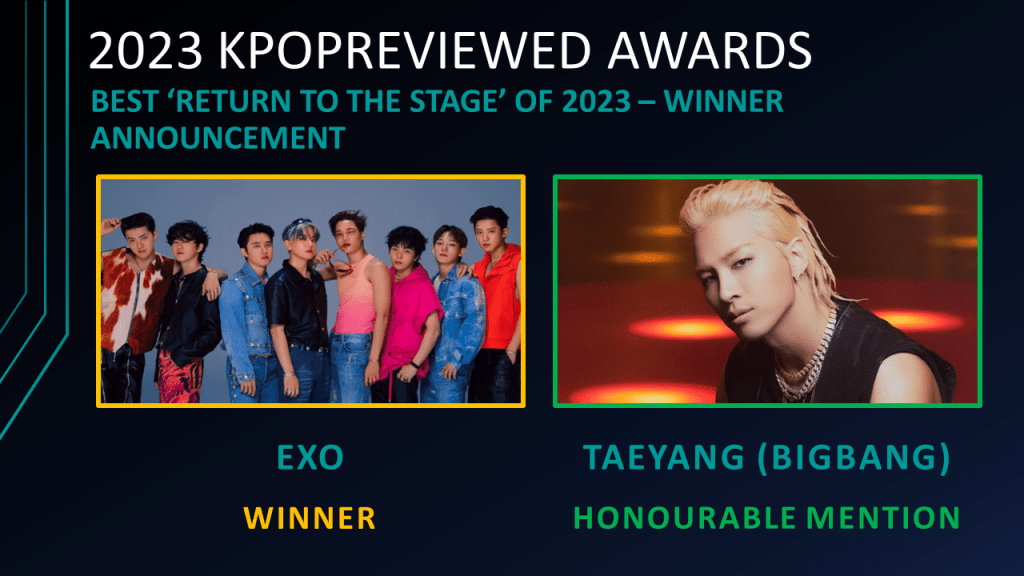 Best ‘Return to Stage’ Comeback of 2023 Nominees:EXO, INFINITE, KARA, TAEYANG (BIGBANG), TEEN TOP, UKISS