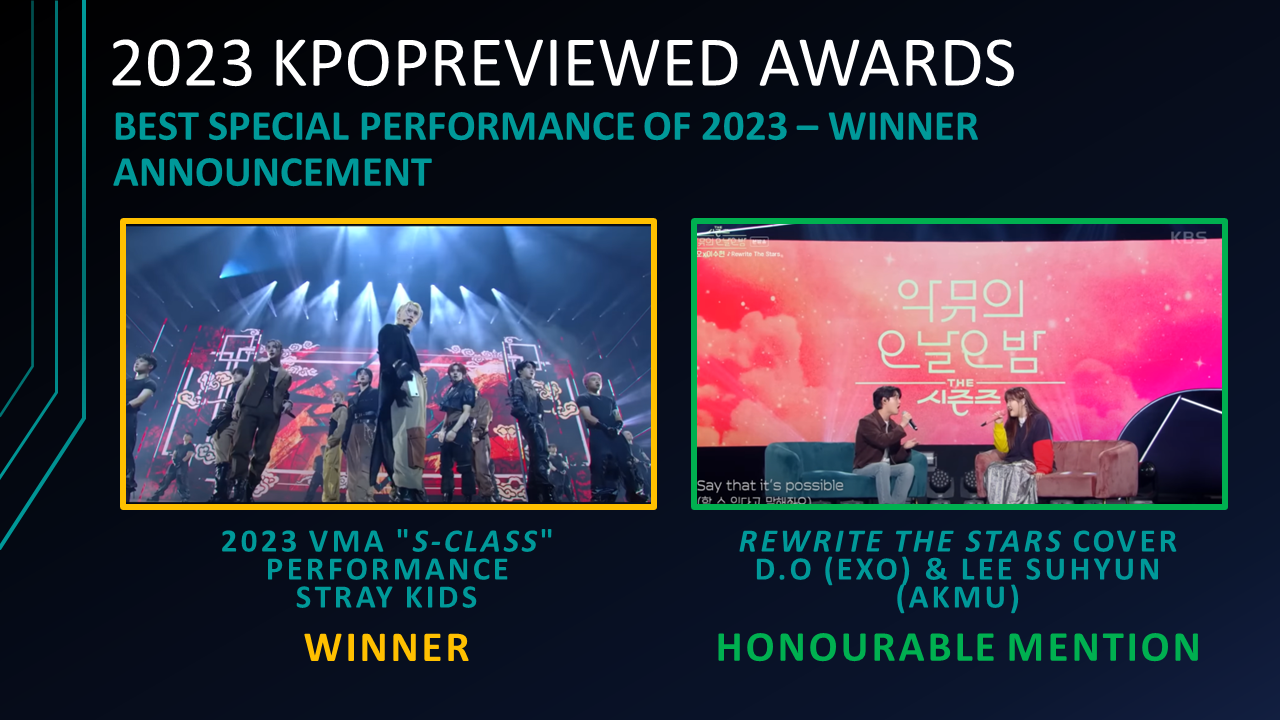 Best Special Performance of 2023 Nominees: 2023 VMA “S-Class” Performance – Stray Kids, BAD (Orig.: CHRISTOPHER) – Peak Time (Alliance C), CRIMINAL LOVE – ENHYPEN SPECIAL STAGE AT MCOUTNDOWN, KARA Song Medley at MAMA Awards 2022 – KARA, Rewrite The Stars (Orig.: Zac Efron & Zendaya) – D.O (EXO) & Lee Suhyun (AKMU), Warrior (by Imagine Dragon) Dance Performance – San (ATEEZ)