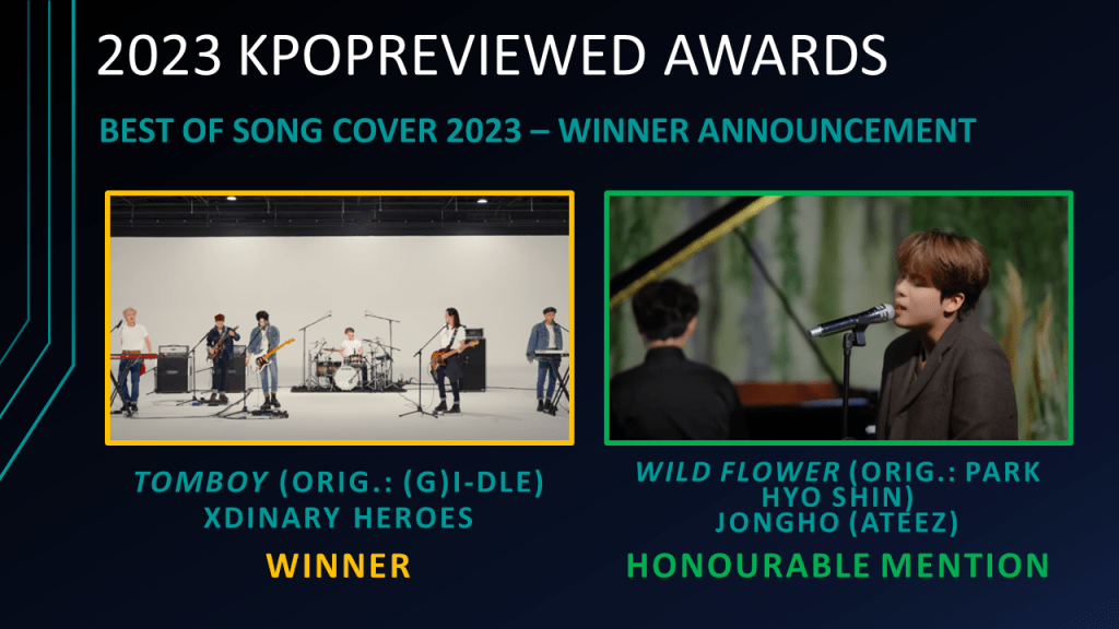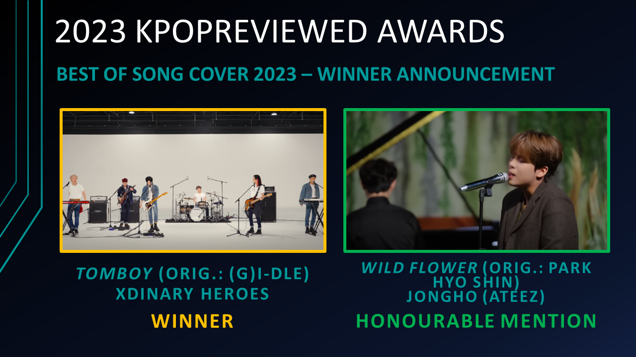Best Song Cover of 2023 Nominees: Dry Flower (Orig. Yuuri) – JAY (ENHYPEN) & Yuuri, ghost town (Orig. JVKE) – YUQI ((G)I-DLE), INVU (Orig.: TAEYEON) – Hanbin (ZEROBASEONE), TOMBOY (Orig.: (G)I-DLE) – Xdinary Heroes, Shut Down (Orig.: BLACKPINK) – KARD, Wild Flower (Orig.: Park Hyo Shin) – Jongho (ATEEZ)