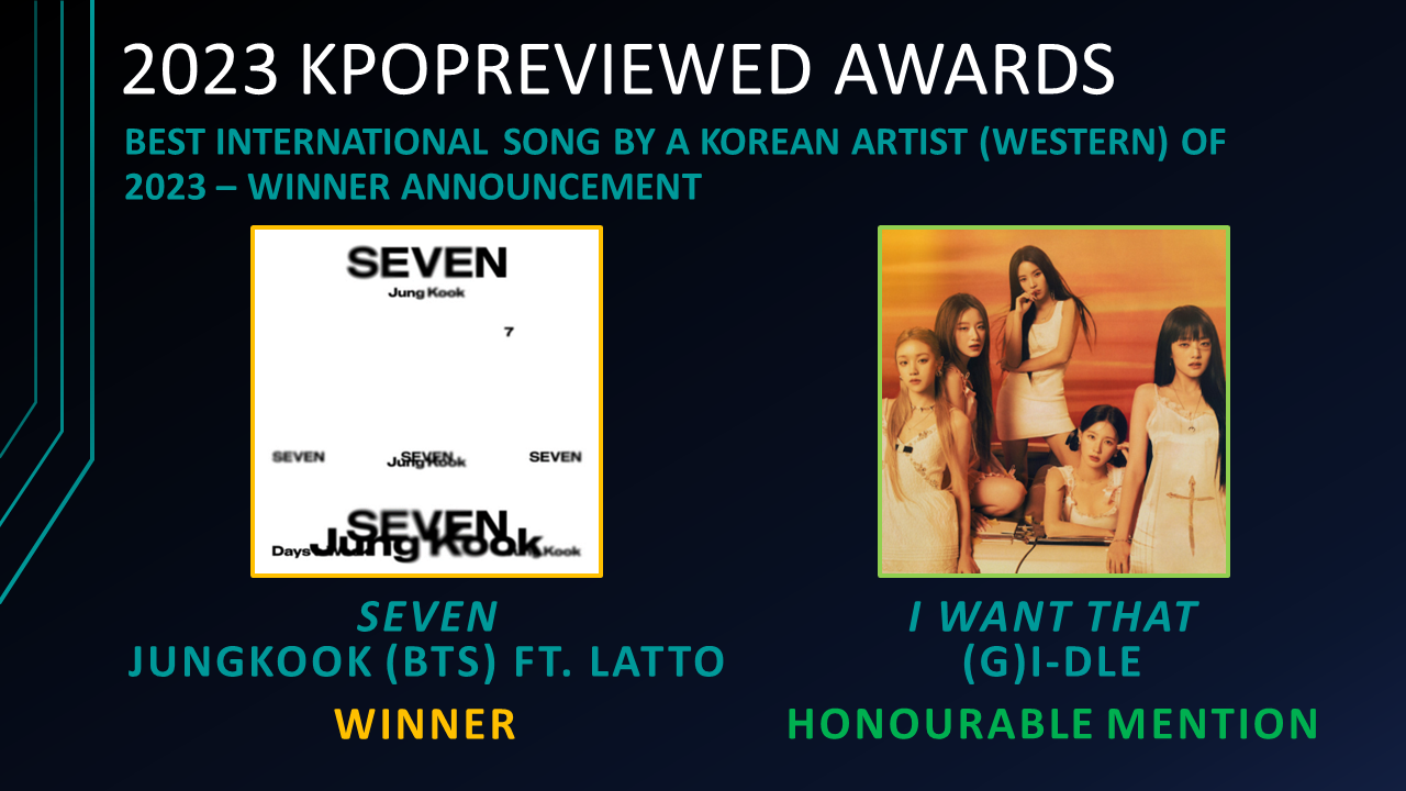 Best International Song By a Korean Artist (Japanese) of 2023 Nominees: Best Friend Forever – NCT DREAM, Ima (Even If The World Ends Tomorrow) – SEVENTEEN, POPPY – STAYC, RINGO – ITZY, Social Path – Stray Kids ft. LiSA, The Sound – Stray KidsBest International Song By A Korean Artist (Western) of 2023 Nominees: Do It Like This – TXT & the Jonas Brothers, Everyone Else Fades – Mark Tuan (GOT7), I Want That – (G)I-DLE, No More Sad Songs – Amber Liu, House on the Hill – Eric Nam, Seven – Jung Kook (BTS) ft. Latto