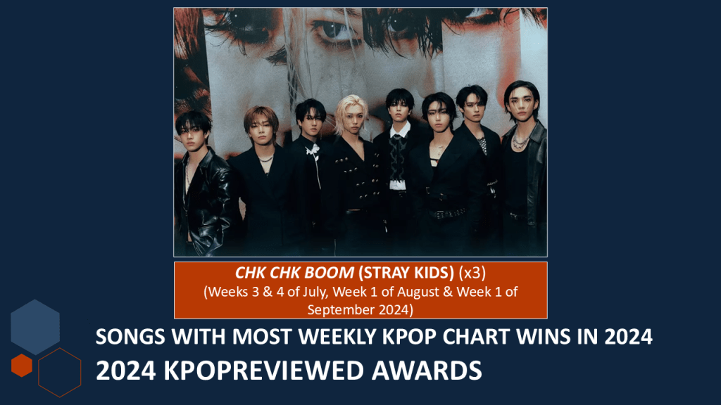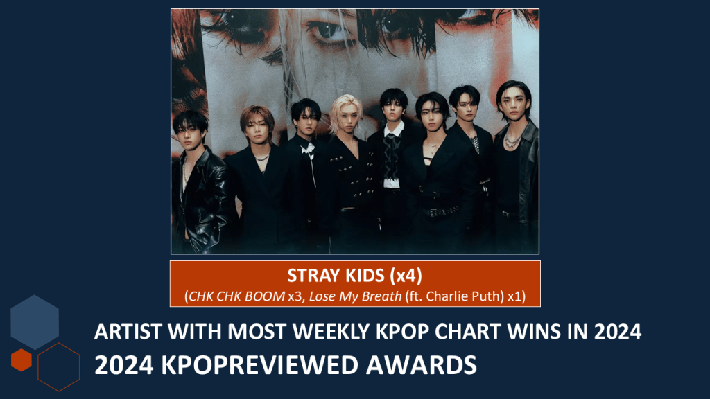 - Song/Artist with most Weekly KPOP Chart Wins in 2024 – awarded to the song/artist which/who ranked in the number 1 spot the most frequently in 2024 on my Weekly KPOP Charts.