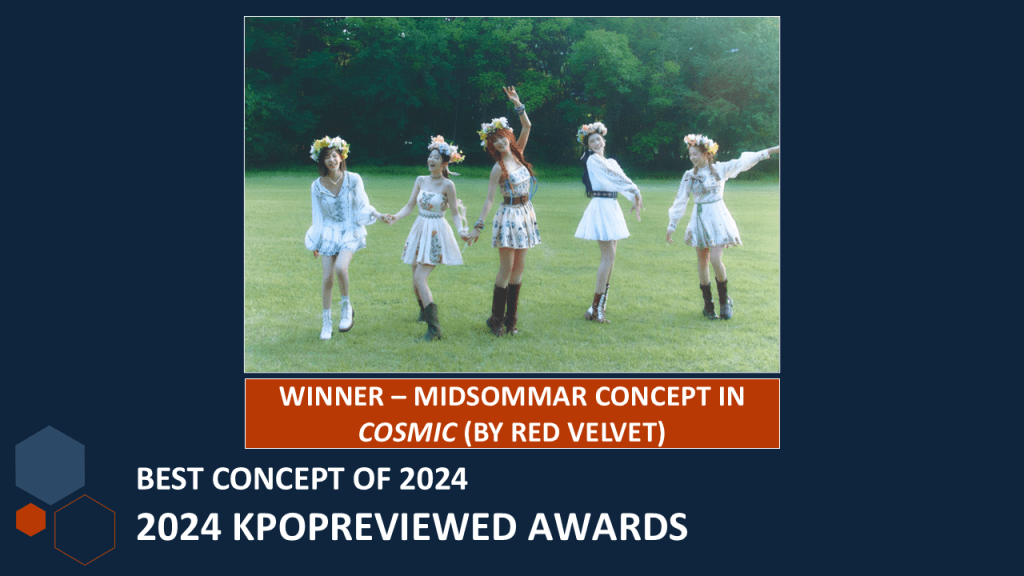 Best Concept of 2024 Nominees: Hieronymus Bosch concept in BAMBAM’s LAST PARADE, Frozen time concept in ENHYPEN’s Sweet Venom, Stolen wand concept in IVE’s Accendio, Secrets between mother/daughter concept in IU’s Shh.., Escape concept in NCT DREAM’s ()SCAPE Film Series & Midsommar Concept in Red Velvet’s Cosmic.