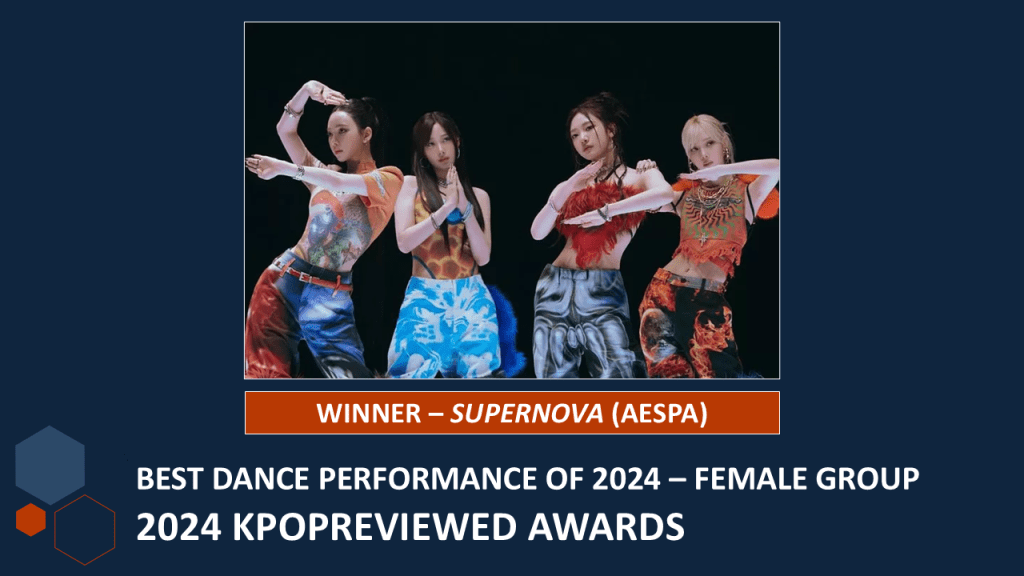 Best Dance Performance of 2024 – Female Group Nominees: Supernova – aespa, Magnetic – ILLIT, UNTOUCHABLE – ITZY, Midas Touch – KISS OF LIFE, CRAZY – LE SSERAFIM & MEOW – MEOVV.