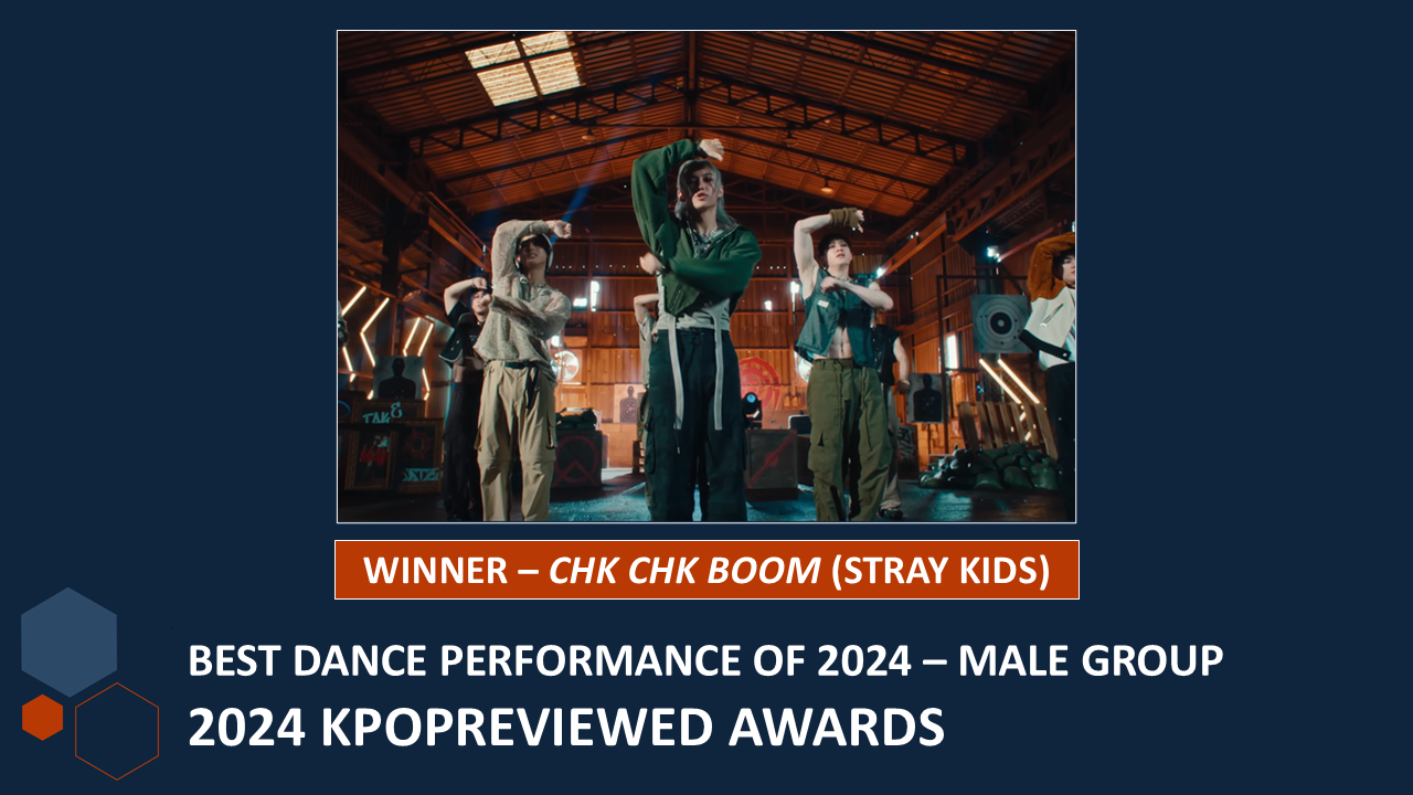 Best Dance Performance of 2024 – Male Group Nominees: Smoothie – NCT DREAM, Boom Boom Bass – RIIZE, MAESTRO – SEVENTEEN, Chk Chk Boom – Stray Kids, plot twist – TWS: & Deja Vu – TXT.
