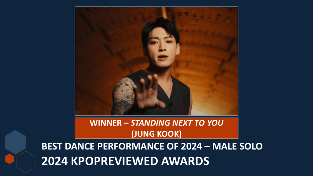 Best Dance Performance of 2024 – Male Solo Nominees: Pineapple Slice – BAEKHYUN, WAIT – DINO, WHO – JIMIN, Standing Next To You – Jung Kook, Sexy In The Air – TAEMIN & GGUM – YEONJUN.