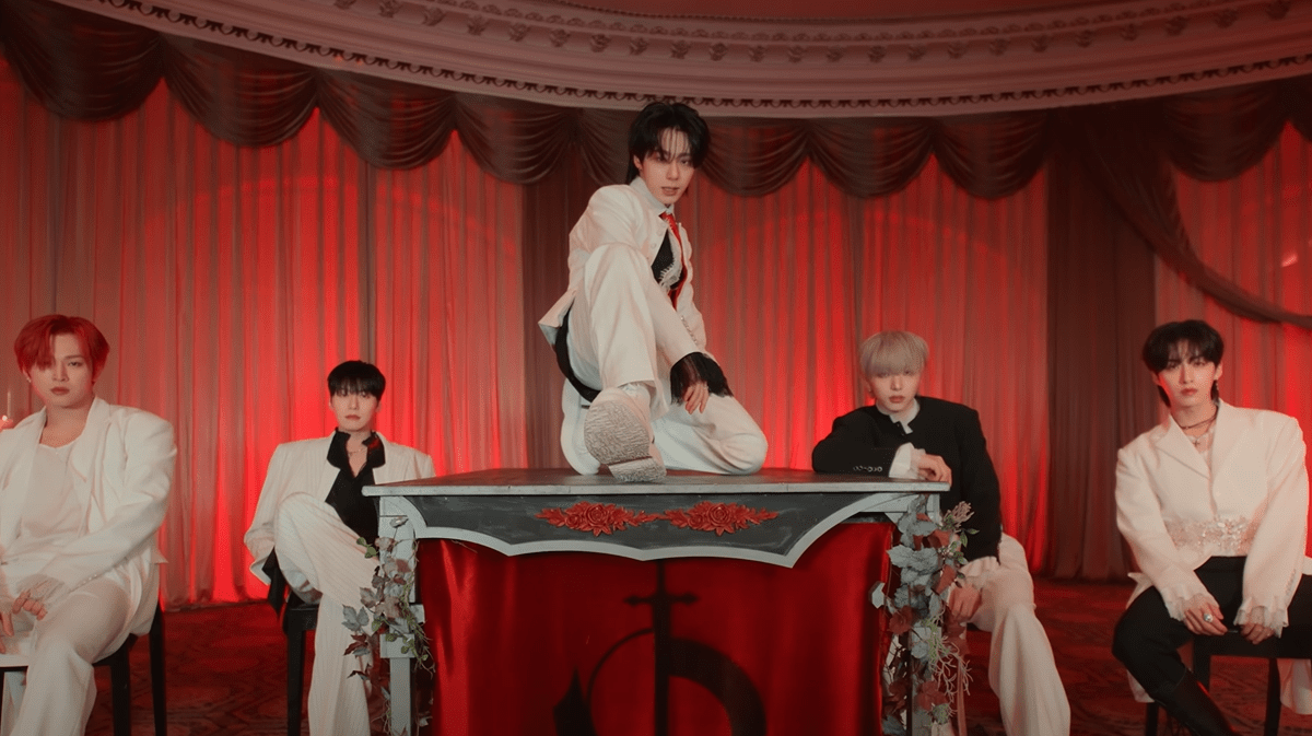 I really enjoyed how theatrical the music video felt. When ONEUS goes down that path, you know the music video will be top-notch. While the regal look was very cool (both members and dancers looked awesome throughout the video) and gave off vampire vibes, I wish they explored the theme a little more, mainly since the music video supposedly explored the “deadly allure of vampires” (taken from Soompi). I also wish they had chosen a better location to shoot the video (or designed a whole castle-like set). Exposed air vents detracted slightly from the potential of the regal and vampire vibes. However, these flaws are made up by retaining the wowing elements from the Road To Kingdom: ACE OF ACE stage, such as the KEONHEE emerging from the tables and SEOHO hanging upside down.