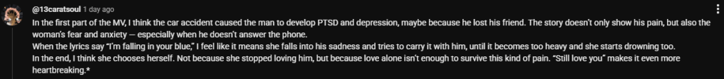 The music video does not feature either DK or SEUNGKWAN. Instead, it features actor Noh Sang Hyun and actress Lee Yoo Mi, who play a couple in the music video. While looking for an interpretation of the music video that makes sense, I found one YouTube comment that explains the theory quite well. I have screenshot the theory below, with a few additional details. At the start of the video, we see the character played by Noh Sang Hyun survive a car crash, but he also witnesses the car explode, which kills the person who remained in the car. A little later on, we see him struggle with his PSTD when an ambulance drives by with its lights on. As for the character played by Lee Yoo Mi, the two phone calls that she received from him and the fact that he didn’t pick up her calls, causing her to become alarmed and scared that something happened to him signifies that she has to constantly put her life on hold for him (i.e., she can’t get the job or a promotion, which is a way to show progression in life). I suspect that this isn’t the first time. The breakup scene at the end is particularly heartbreaking, especially since no words were said between the pair. But yet, you could understand that she still loves him (through her turning back), and he finally realises that if he loves her, he should let her go.