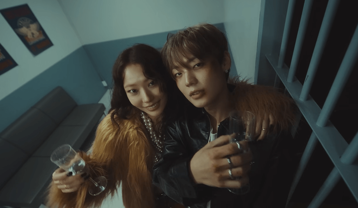 KANG YUCHAN plays a bad boy in the music video for Champagne Poppin’. At the police station after being arrested, KANG YUCHAN runs into the lead female character played by PARK HEE JUNG, who has also been arrested. They end up establishing a relationship in the short time they are held in the police cell, before somehow escaping and overpowering the officers. They then go on the run, taking an old storekeeper hostage in her shop and stealing money from the bank. Essentially, they become a modern-day Bonnie and Clyde. In the end, they celebrate their spree and their capture by the police. I liked the story, but thought the ending was pretty tame. I think more of their spree and them running off together would have been a good story (though it doesn’t fit the Bonnie and Clyde story).