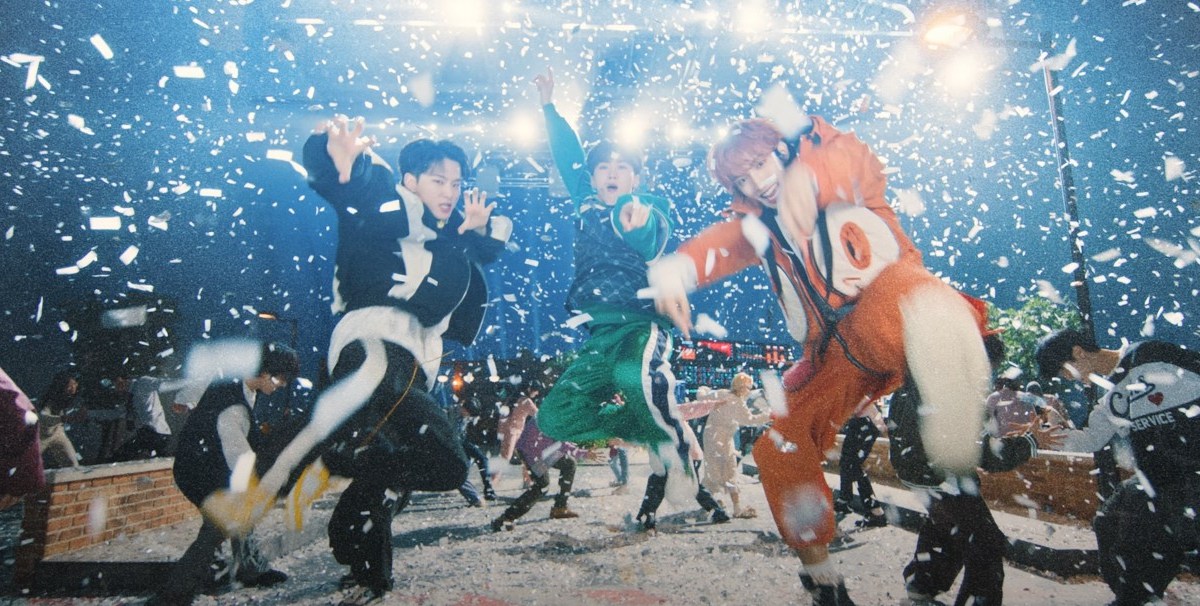 As mentioned earlier, the music video visually conveys a few of the messages. With the youth mindset, this is done via the choruses, where the members have fun. They take the office workers to the pub while also partying it up at the end. The members also hand out jeans to bring that alternative meaning to the Korean title into the choreography. They make it the uniform of having fun, which makes sense, given jeans are more casual than office wear or school uniforms. The music video also features cameos from some Korean actors like Uhm Jung Hwa, Gal So Won, Jung Young Joo and Moon Sang Hoon.