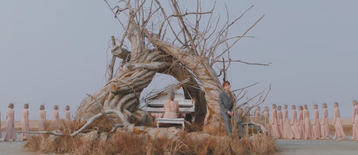 I also like how aesthetic the music video is. It isn’t artsy in any way but rather it is simplistic. It is all shot outside, with a very large tree-trunk like structure in the centre of the video. Within the centre, we find Chen and a piano player, whose piano is embedded into the structure. Surrounding them is are many female dancers, all dressed in a pale pink-ish colour that really works well with the setting. That is pretty much it to the video. I came across a news article today that stated that the video took 6 hours of filming and that Chen was concerned about whether he conveyed the right emotions. Well, those 6 hours paid off and Chen did wonders in the video.