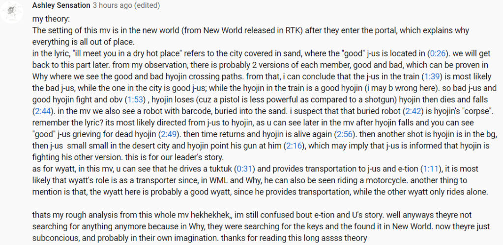 As you can tell, the music video is quite confusing and the above theory is incomplete. There are a few more theories in the YouTube comment, so have a read to see which one is plausible. I really liked the visuals of this music video. It also seems like WM Entertainment recently invested in a green screen, given that it is used here and in Oh My Girl’s Nonstop music video as well. In this video, the usage of the visual effects were pretty good and does not disappoint.
